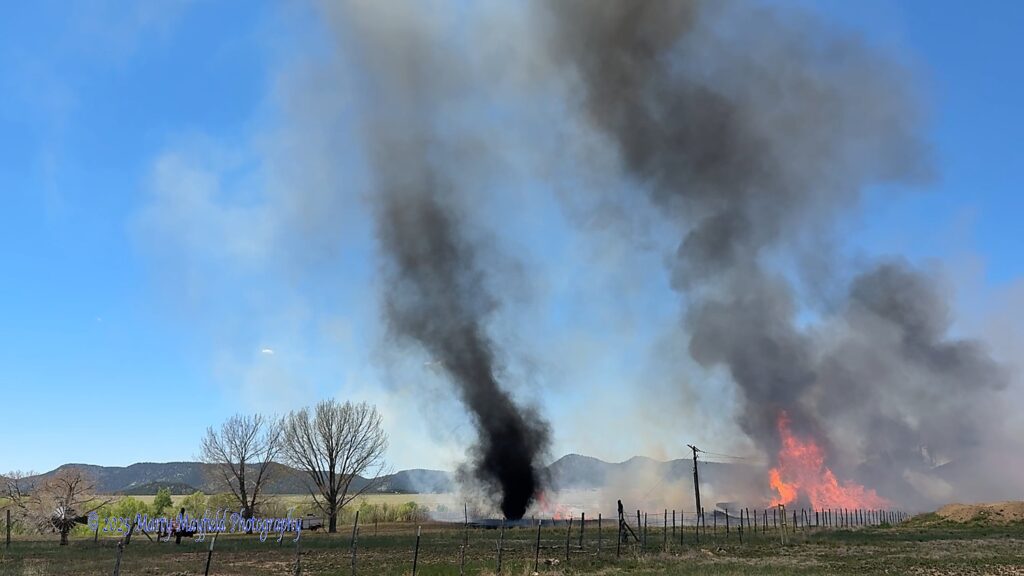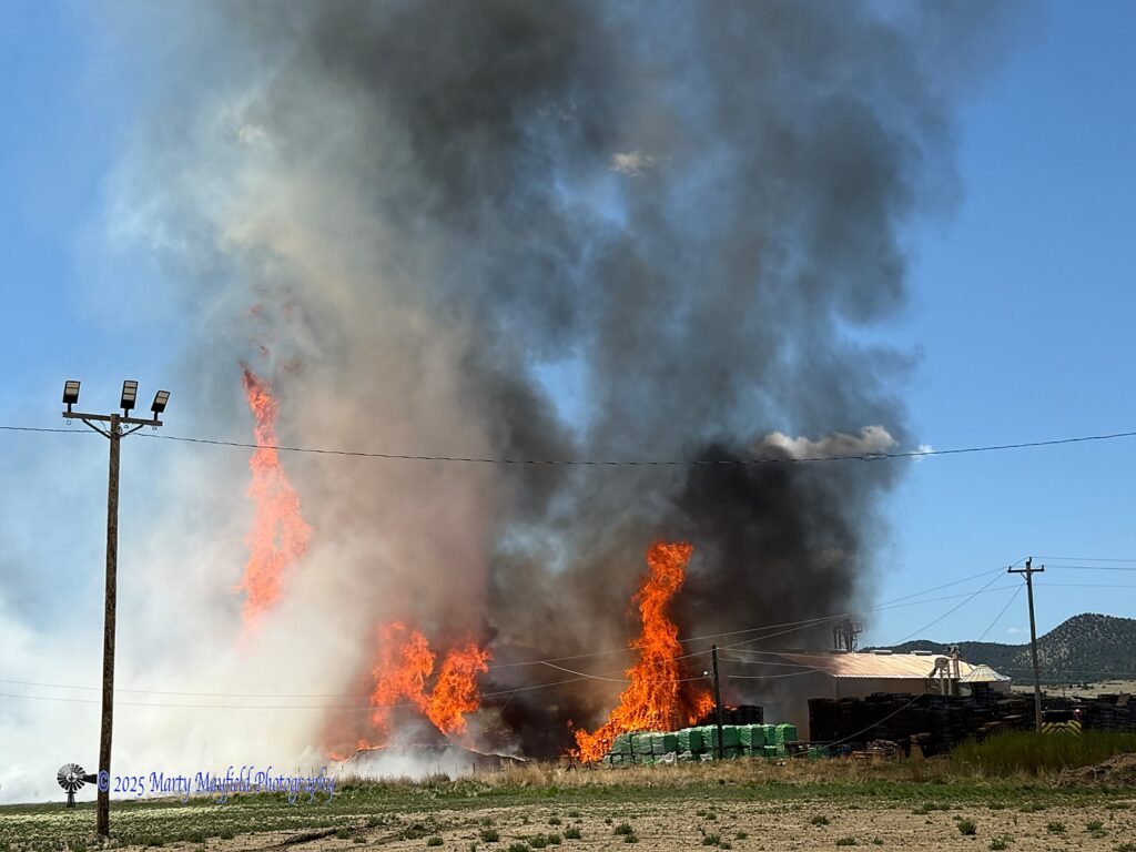 According to Raton Fire Chief Anthony Burk the blaze started after hot high pressure hydraulic fluid spewed from a front end loader and ignited wood chips that quickly spread to wooden pallets that were just north of the loader. It didn’t take long before the 20+ foot high stacks of pallets were putting up black smoke high in the sky over Raton.
