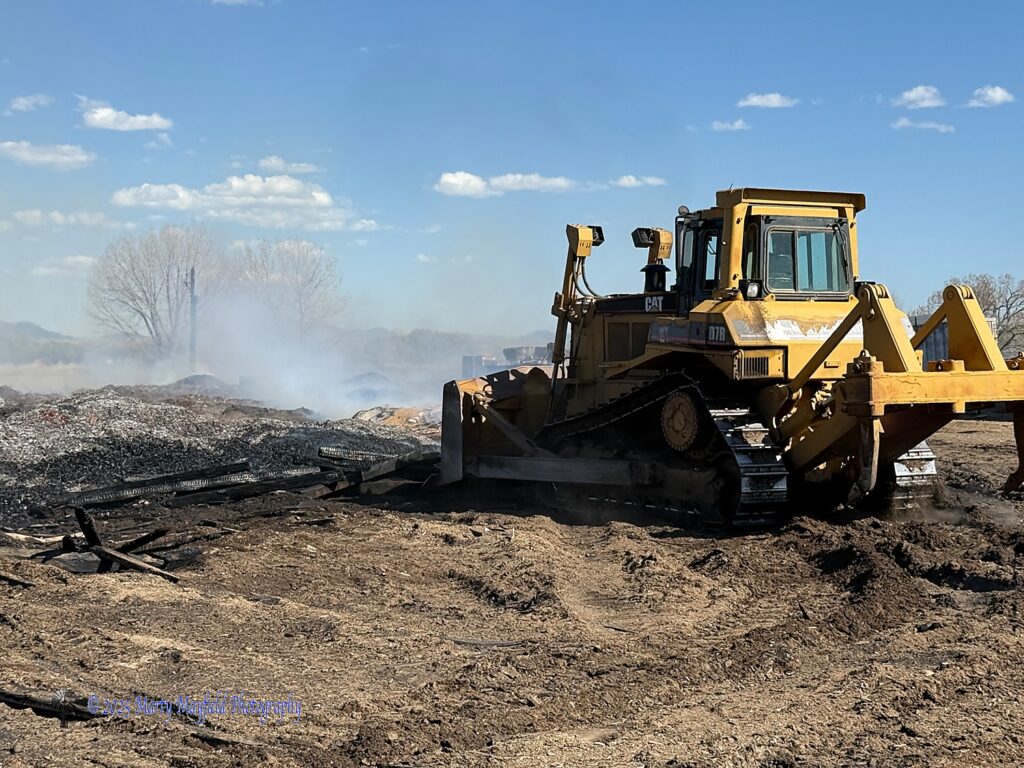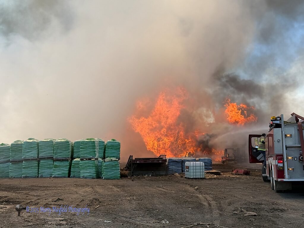 By late afternoon fire fighters could take a breath and grab a bite to eat before continuing mop up operations. Chief Burk figured that fire fighters would have to babysit the fire for at least the overnight hours to keep any flare ups from getting away from them. He noted it could be a couple of days before fire fighters could call this blaze out as wood chips continued to smolder late Monday afternoon. A dozer was brought in to spread out the wood chips to make it easier to extinguish any flames that were left over.