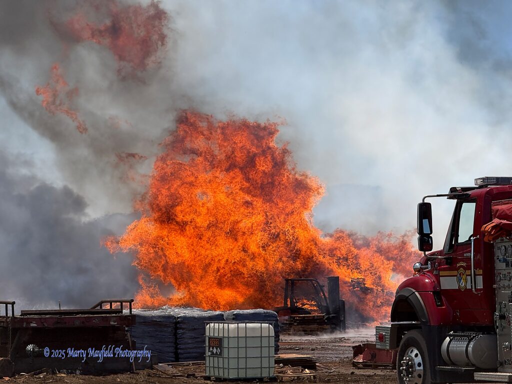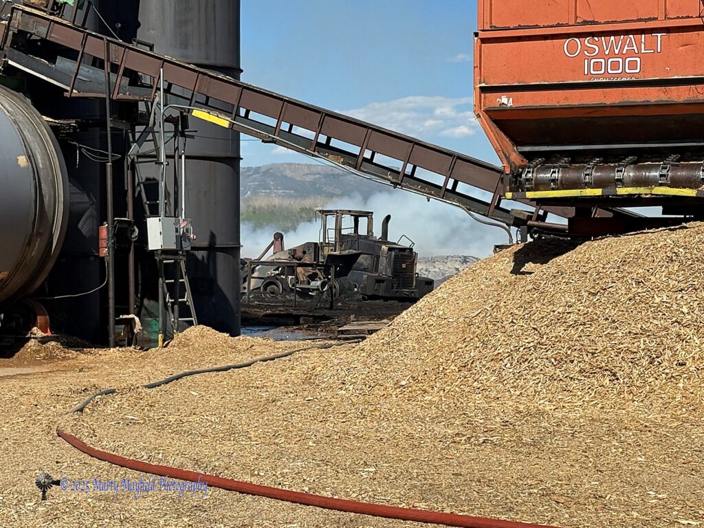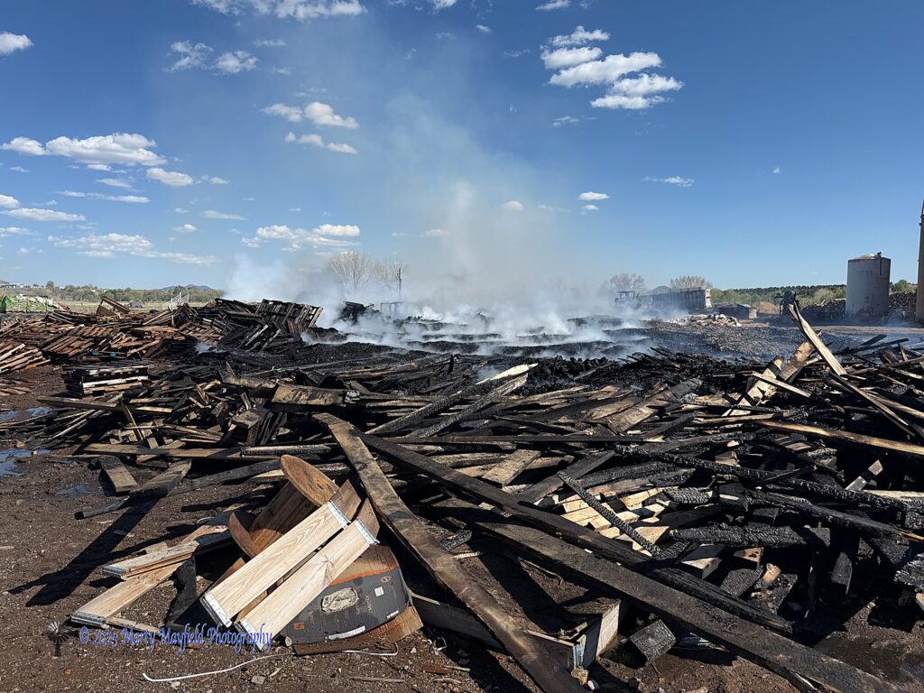 A huge pile of pallets burns on the south end of the Western Wood Products facility Monday afternoon May 12, 2025.Fire Fighters battle a pallet fire on the south end of the Western Wood Products facility Monday afternoon May 12, 2025.Front end loaders from the City of Raton arrived on scene to help build a fire break around the south end of the facility, one of them was later moved to the pallet pile to remove unburned pallets.A front end loader from the City of Raton arrived to help build a fire break on the east side of the burned area as fire fighters battle a pallet fire on the south end of the Western Wood Products facility Monday afternoon May 12, 2025.A power pole suffered dearly as the fire burned it and melted the wire going to it on the east side of the Western Wood Products facility Monday afternoon May 12, 2025.Smoke billowed high into the sky Monday afternoon, May 12, 2025, as fire fighters battled a pallet fire on the south end of the Western Wood Products facility.Flames burned hot as Fire Fighters battled a pallet fire Monday afternoon May 12, 2025 on the south end of the Western Wood Products facility.Lots of fuel to burn as a huge pile of pallets caught fire Monday afternoon May 12, 2025 on the south end of the Western Wood Products facility.A smoke devil develops on the south side of the fire and spins off into the grassy area south of the fire Monday afternoon May 12, 2025 during the fire on the Western Wood Products facility.Not much left but a piece of rubber to burn off this fork lift after the pallet fire at Western Wood Products Monday afternoon in South Raton.Wooden Pallets that were stacked about 20+ feet high are reduced to mere ashes and continue to smolder after fire fighters battle the blaze for a couple of hours Monday afternoon at the Western Wood facility south of Raton.Untouched by the fire these wood chips will be watched for possible fire as the loader that was the cause of the fire lies in ruins on the south end of the Western Wood Products facility Monday afternoon, May 12, 2025.Smoke still filters through the air as the loader that caused the fire sits in ruins at the south end of the Western Wood Products facility south of Raton Monday afternoon May 12, 2025.Flames can still be seen in the wood chip piles on the south end of the Western Wood Products facility south of Raton Monday afternoon May 12, 2025.A dozer was brought in to help with the clean up final extinguishment of the pallet fire Monday afternoon May 12, 2025 at the Western Wood Products facility south of Raton.