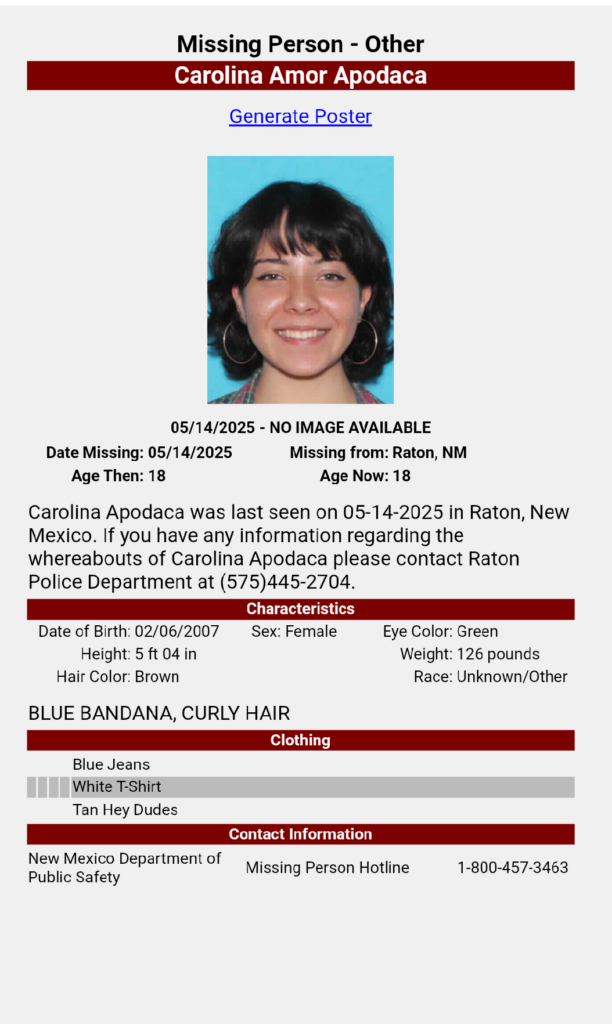 By Marty Mayfield KRTN Multi-Media Carolina Apodaca was found alive on Saturday, May 18th just after 8:00 p.m. Good news was received by the community of Raton with the safe return of missing teenager Carolina Apodaca. The 18 year-old was reported missing on Wednesday, May 14 and was found walking…