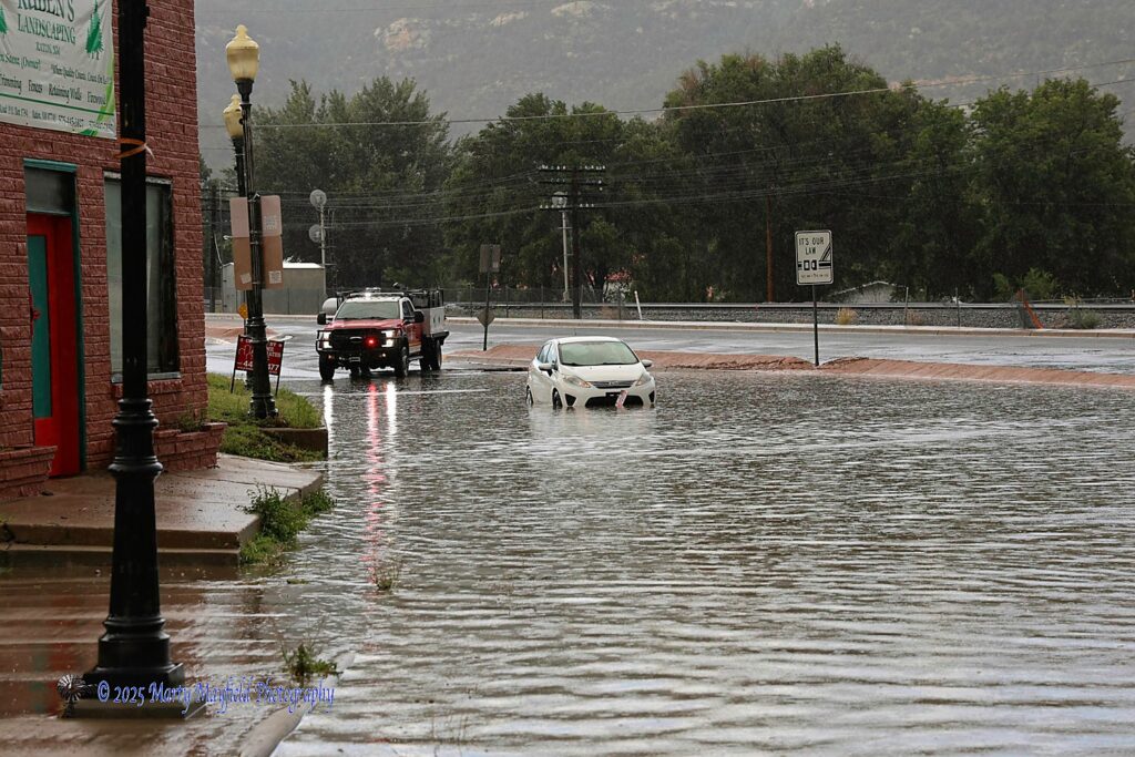 By Marty Mayfield KRTN Multi-Media It rained once again in Raton, this time causing flooding in north Raton where Canyon Drive meets North Second Street stranding a car in the roadway. The rain came down hard and fast with Ambient weather stations around town reporting from .96 in north Raton…