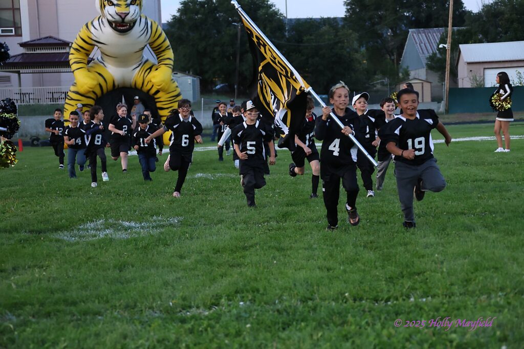 Temperatures were in the mid sixties at kickoff with a full moon shining down on the Jungle and the American Flag hanging limp for the game and the strains of the National Anthem still echoing for the kickoff. It was a perfect night for football as everything went right for the Tigers and in less than 15 seconds after the kickoff, Raton’s Cael Walton would streak down the far sideline with the ball for a 90 yard TD and Logan Elliott’s extra point made it 7 – 0 with 11:44 remaining.