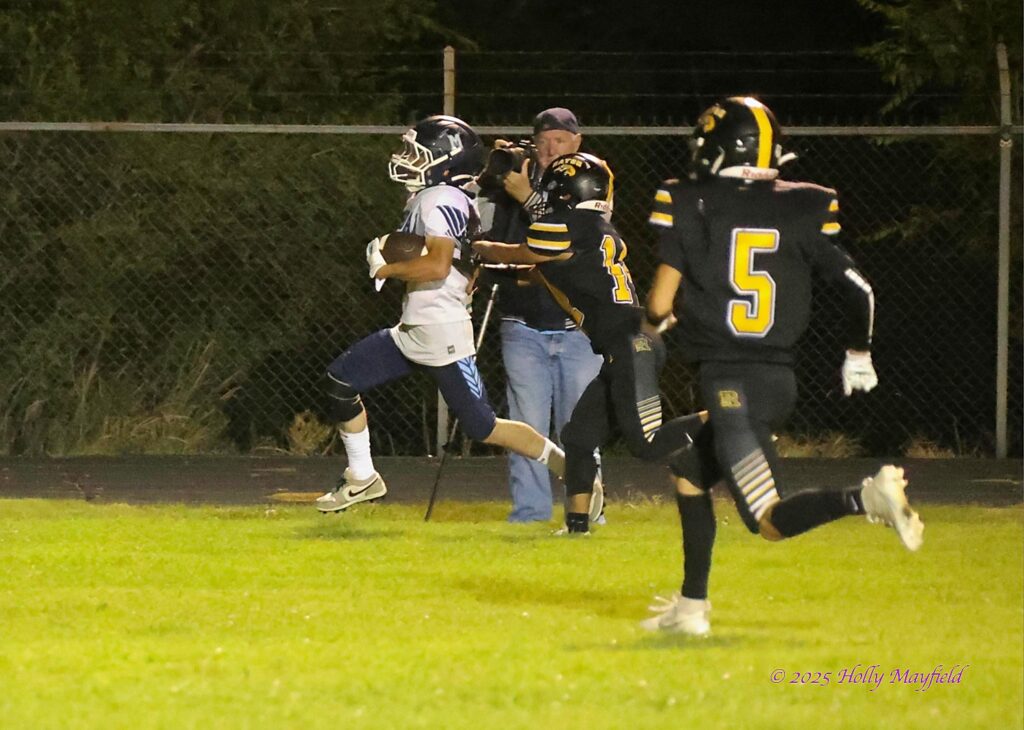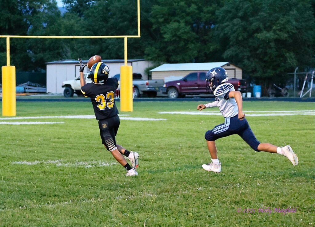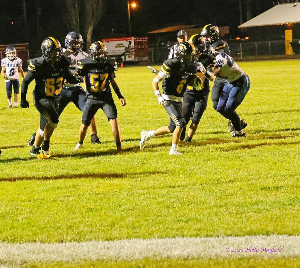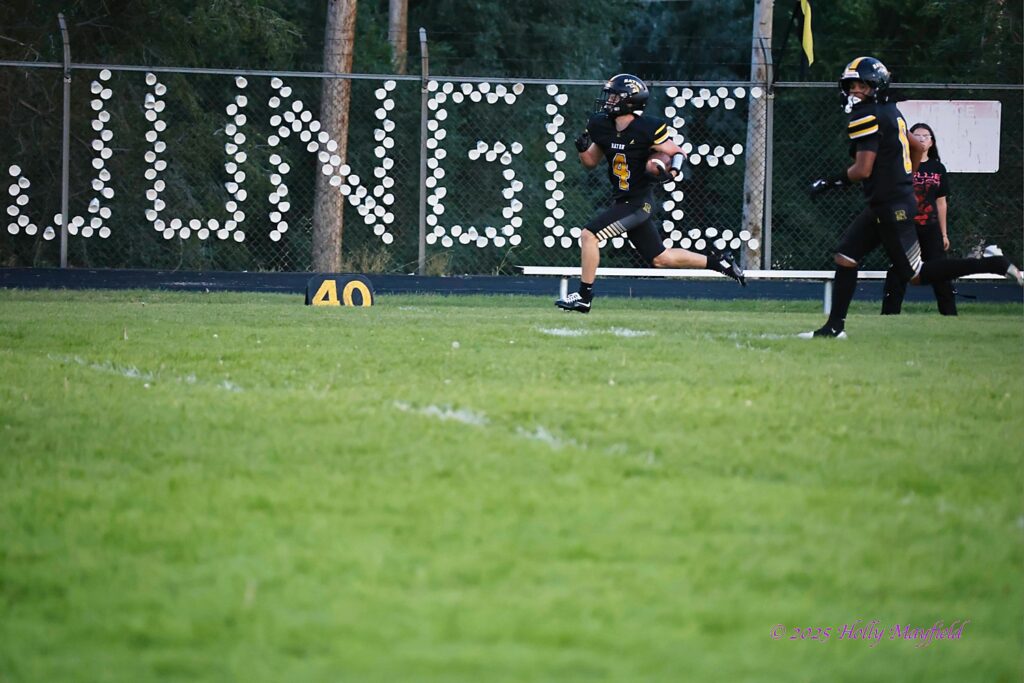 Raton’s defense forced the Miners to punt again and took over on their own 40, and on first down Cael Walton took the handoff and went up the middle broke outside and out ran all the defenders and was ahead of the pursuit by 20 yards when crossing the goal line, scoring a 60 yard TD to push a continuous clock while still in the first period and led 35 – 0.