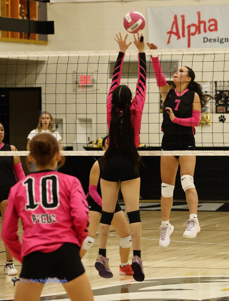 Paige Lemons pushes the ball over the net as Angel Montoya goes up for the block during the district match with Pecos in Tiger Gym Saturday afternoon October 25, 2025.