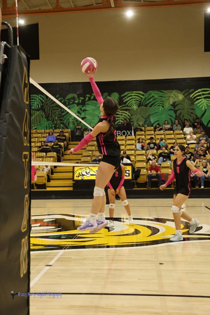 Jennifer Matorano goes up with the push during the district match with Pecos in Tiger Gym Saturday afternoon October 25, 2025