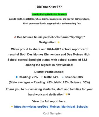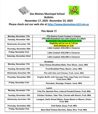 Des Moines Municipal School Bulletin November 17, 2025 – November 23, 2025 November 14, 2025 Published in Schools More from SchoolsMore posts in Schools »Maxwell Municipal Schools to Break Ground on New K–12 SchoolMaxwell Municipal Schools to Break Ground on New K–12 SchoolREGULAR MEETING OF THE RATON BOARD OF EDUCATION THURSDAY, MARCH 19, 2026 @ 6:00 P.M.REGULAR MEETING OF THE RATON BOARD OF EDUCATION THURSDAY, MARCH 19, 2026 @ 6:00 P.M.SPECIAL MEETING OF THE RATON BOARD OF EDUCATION THURSDAY MARCH 19, 2026 @ 6:00 P.M.SPECIAL MEETING OF THE RATON BOARD OF EDUCATION THURSDAY MARCH 19, 2026 @ 6:00 P.M.Des Moines Board of Education will meet In Regular Session on Tuesday, March 10, 2026 at 6:00pmDes Moines Board of Education will meet In Regular Session on Tuesday, March 10, 2026 at 6:00pmDes Moines Municipal School Bulletin March 2, 2026 – March 8, 2026Des Moines Municipal School Bulletin March 2, 2026 – March 8, 2026