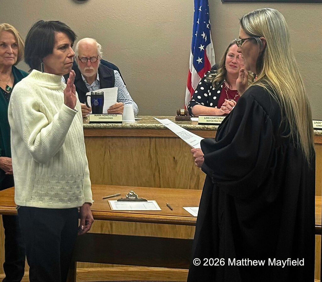 Newly elected city commissioner Dan Campbell was sworn in Tuesday evening January 6, 2026 before the special city commission meeting by Municipal Judge Christine Piancino. Looking on are new Mayor Pro-Tem Mark Honeyfield and new Mayor Lori Chatterley.