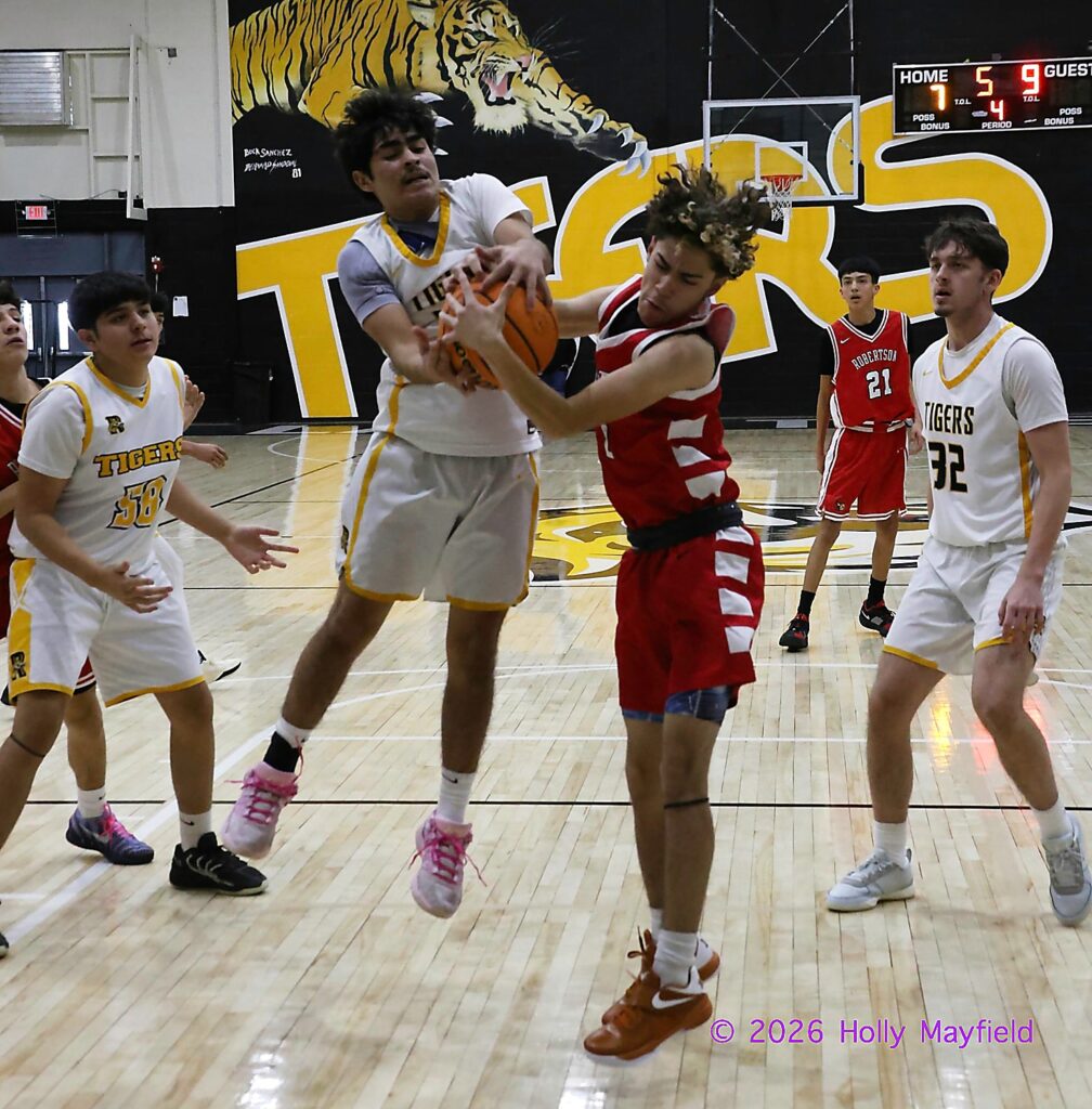 In the boy’s varsity game Raton was short two key players, out with medical issues and Robertson took advantage of that especially with 6’6″ Senior Nathan Gonzales who found the shot ball several times to prevent Raton scores. Raton also struggled to make the shots count. By halftime the Tigers were behind by a 49-23 score. The second half of play soon saw the Cardinals pull away to start a running clock and finish with an 81-38 final.