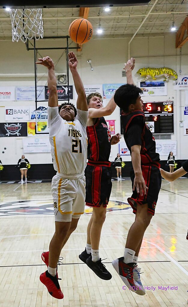 Harlem Coley goes for the shot as Diego Jaramillo and Brennen Diesler fly by on the block Saturday afternoon January 10, 2026 in Tiger Gym during gate varsity game.