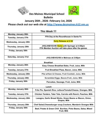 Des Moines Municipal School Bulletin January 26th, 2026- February 1st, 2025 January 22, 2026 Published in Schools More from SchoolsMore posts in Schools »Maxwell Municipal Schools to Break Ground on New K–12 SchoolMaxwell Municipal Schools to Break Ground on New K–12 SchoolREGULAR MEETING OF THE RATON BOARD OF EDUCATION THURSDAY, MARCH 19, 2026 @ 6:00 P.M.REGULAR MEETING OF THE RATON BOARD OF EDUCATION THURSDAY, MARCH 19, 2026 @ 6:00 P.M.SPECIAL MEETING OF THE RATON BOARD OF EDUCATION THURSDAY MARCH 19, 2026 @ 6:00 P.M.SPECIAL MEETING OF THE RATON BOARD OF EDUCATION THURSDAY MARCH 19, 2026 @ 6:00 P.M.Des Moines Board of Education will meet In Regular Session on Tuesday, March 10, 2026 at 6:00pmDes Moines Board of Education will meet In Regular Session on Tuesday, March 10, 2026 at 6:00pmDes Moines Municipal School Bulletin March 2, 2026 – March 8, 2026Des Moines Municipal School Bulletin March 2, 2026 – March 8, 2026