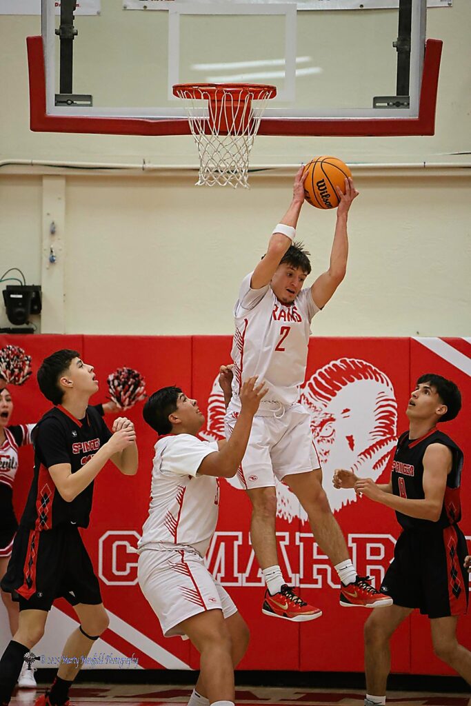 Logan Sahd gets air as he brings down the rebound Saturday evening gin Cimarron during the District 5A championship game