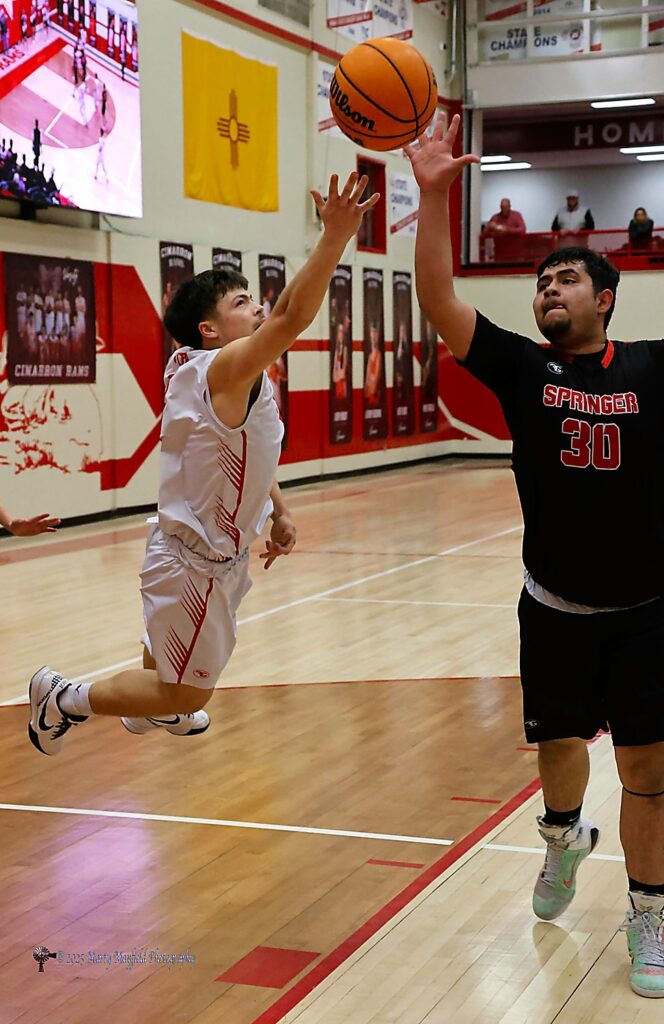 Springer’s Josiah Vasquez drives around Cimarron’s Orion Ledoux and heads for the basket Saturday evening during the District 5A championship game in Cimarron.