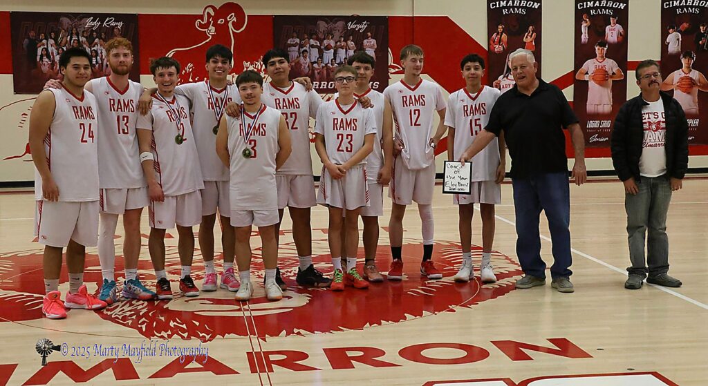 The Cimarron Rams honoring their Head Coach Eloy Brazil who was chosen District 5A Coach of the Year. An honor well deserved after 50 years of basketball coaching. Brazil started coaching in 1976 and when asked if this year will be the year he said, “I keep saying it is but here I am.”