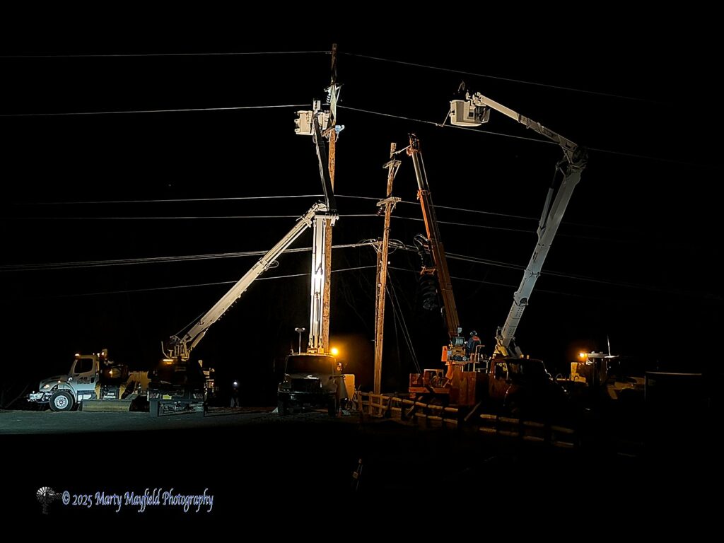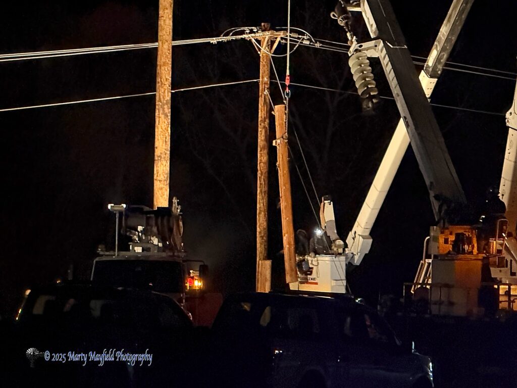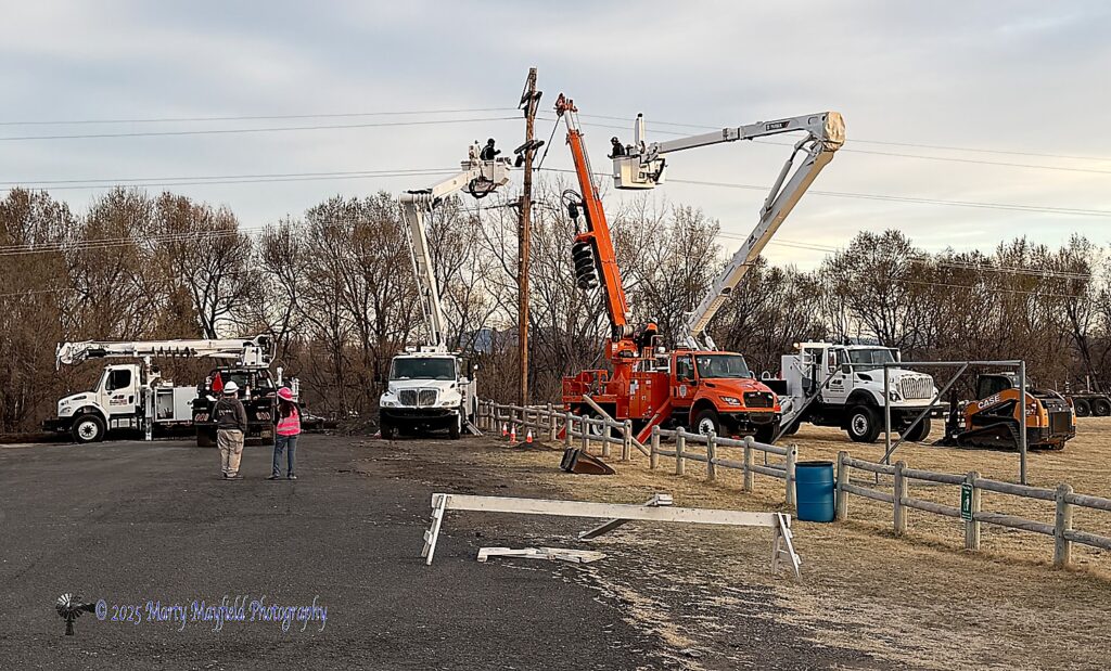 While the job went pretty smooth for the most part the job was not without its horror as someone took a shot at the line crews working at the soccer field with one lineman reporting that he heard something swish by his head. Raton PD and Colfax SO swarmed the area but no shooter was found according to Raton Police. Work on the line continued and by 9:45 p.m. the lines had been moved to the new poles. Some minor wire work still needed to be done and cleanup work had to be completed before power could be restored.