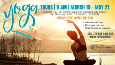 Event by Mt. Carmel Wellness & Community Center 911 Robinson Ave, Trinidad, CO, United States, Colorado 81082 Duration: 1 hr Public · Anyone on or off Facebook Yoga – Here Comes the Sun Instructor: Dianna Morefield Thursdays | March 19- May 21 | 9:00 – 10:00 am Ziccardi Hall, Mt.…