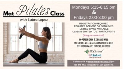 Mat Pilates Class with Sabra Lopez Mondays 5:15-6:15 pm & Fridays 2:00-3:00 pm CLASS IS LIMITED TO 17 PARTICIPANTS IN-PERSON ONLY | Ziccardi Hall | Mt. Carmel Wellness & Community Center 911 Robinson Ave. Trinidad, CO 81082 REGISTRATION REQUIRED ! Register for one or both days below: Monday registration link | Friday…