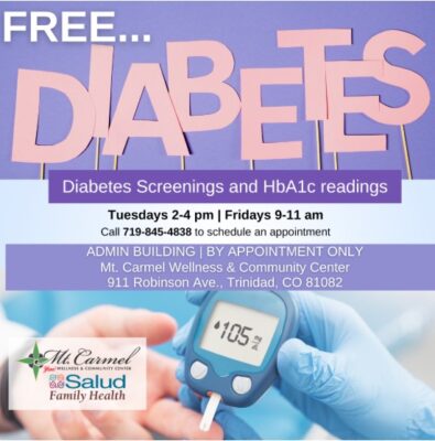 Free Diabetes Screening Mt. Carmel Wellness & Community Center (Admin Building) 911 Robinson Ave., Trinidad, CO 81082 Tuesdays 2-4 pm | Fridays 9-11 am Call 719-845-4838 to schedule an appointment.