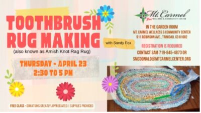Toothbrush Rug Making (also known as Amish Knot Rag Rug) with Sandy Fox April 23 | 2:30 - 5:00 pm Garden Room | Mt. Carmel Wellness & Community Center | 911 Robinson Ave., Trinidad, CO 81082 Free Class - Donations greatly appreciated - Supplies provided CLICK HERE TO REGISTER Call…