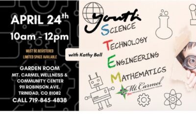 Youth STEM with Kathy Bell April 24, 2026 | 10:00 am - 12:00 pm Garden Room | Mt. Carmel Wellness & Community Center 911 Robinson Ave., Trinidad, CO 81082 Registration required. Call 719-845-4838 to register or ask questions.