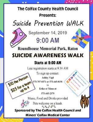 A Suicide Prevention Walk is being held in Raton on September 14, 2019. Since Colfax County has one of the highest rates of suicide in New Mexico, the Colfax Health Council is trying to raise awareness. Please forward this to your friends and family and participate. Thank you for showing…