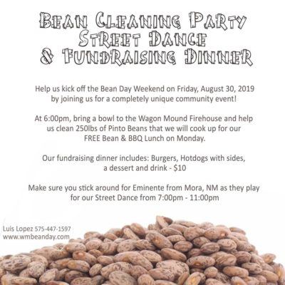 Bean Cleaning starts at 6:00PM Bring a bowl and help us clean Pinto Beans Fundraising Dinner -$10 Burgers, Hot Dogs, Sides, Drink & Dessert Street Dance 7:00pm - 11:00pm Music by Eminenete Band from Mora, NM