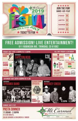 2019 9th Annual Festival Schedule of Events Date: Friday, July 19th, 2019 Location: Mt. Carmel Wellness and Community Center Campus, 911 Robinson Avenue, Trinidad CO 81082 Time: 4:00 – 11:00 PM Tickets: Free; no registration is required Schedule of Events: 4:00 – 8:00pm: Train Rides and Kids Games 4:00 –…