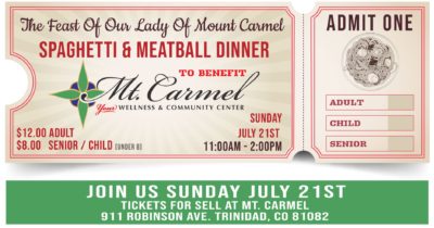 The Feast Of Our Lady Of Mount Carmel, SPAGHETTI & Meatball Dinner, Tickets are for SALE! Contact us at 719-845-4880 to buy yours! $12. Adult Ticket and $8. Senior / Child Tickets.