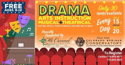 Mt. Carmel brings you the Colorado Springs Conservatory: a week of musical and theatrical arts instruction. Only 30 spots available!! A FREE program for the youth of Trinidad ages 8-12 yrs old. July 15-20 from 9-4 with a special public performance at the Mt.Carmel Festival July 20 @ 4pm Call…