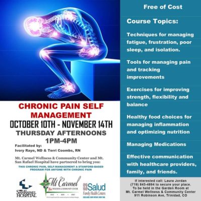 Do you suffer from chronic pain? Mt Carmel Wellness & Community Center and San Rafael Hospital have partnered to bring you this Chronic Pain Self-Management program. If interested call: 719-845-4894 to reserve your spot!