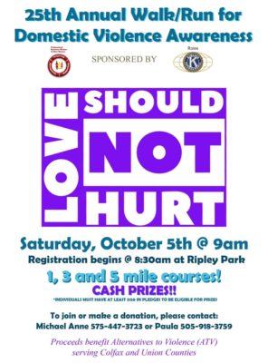 Join with the Raton PBW & Raton Kiwanis Club for the 2019 Walk for Domestic Violence Awareness! All proceeds go to Alternatives to Violence here in Raton and go a long way to helping cover costs that grants do not specifically address. With your help, this community support helps ATV…