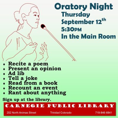 Main room of the library Any spoken-word presentation Eight minutes or less We don't censor - that's up to the speaker Sign up at the library to speak Come and listen - we need an enthusiastic audience That's right! It has finally returned. Oratory Night in the main room of…