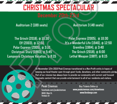 We are looking for a sponsor for our 1st Annual Christmas Spectacular!!! These films will be played December 20th-23rd and will be free admission for included titles only. (New first run shows will still require paid admission) The films we have booked are: Polar Express (2005) The Grinch (2018) Elf…