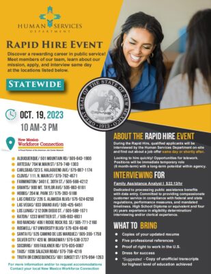 The Income Support Division in Colfax County will be having a rapid hire event at (1233 Whittier St. Raton, NM 87740) on October 19, 2023 from 10:00AM-3:00PM