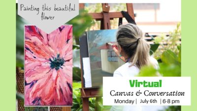 Meet new friends, relax and socialize while taking an art lesson. Canvas & paints included. Join us for Virtual Canvas & Conversation July 6th from 6-8 pm $15 per person. Register below: https://us02web.zoom.us/meeting/register/tZckdO-rqTojHNBvmqyF6rs0pFUYkh2ps6KI You will receive a Zoom Confirmation Email that includes your link to join upon registration. You will…