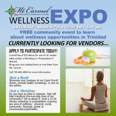 SAVE THE DATE! FEBRUARY 1ST! Mt. Carmel Wellness & Community Center is sponsoring a free event to learn about wellness opportunities in our community. Talk to wellness experts, attend workshops, enroll in classes, browse vendor booths and much more! +FREE ADMISSION +FREE FOOD +FREE WORKSHOPS Vendors wanted and visitors welcome!…