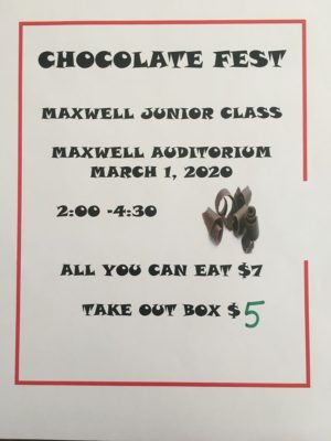 The Maxwell Junior Class presents another delectable chocolate fest! All you can eat for $7 per person, or come by to pick up a take-out box for $5. Come join us!