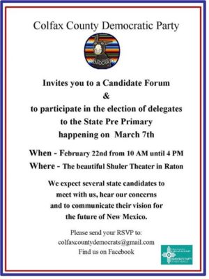 The Colfax County Democrats will be hosting a candidate forum on February 22nd at the Shuler from 10 until 4. This will be an exciting meeting with several state and national candidates coming to meet us and to share their vision. This is an important step in the election process…